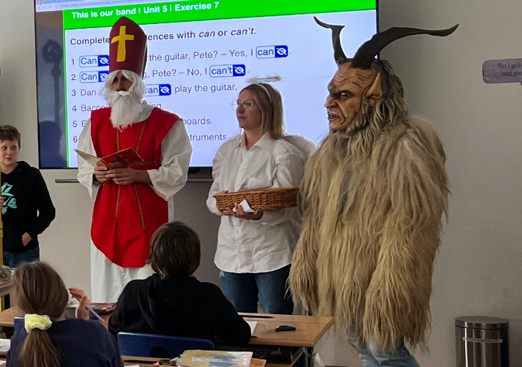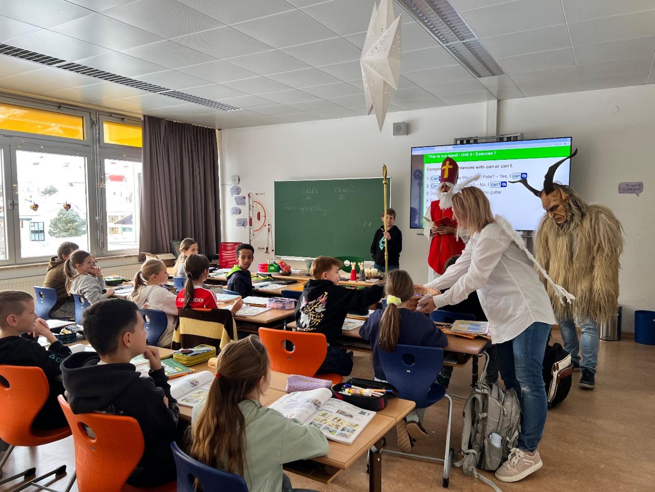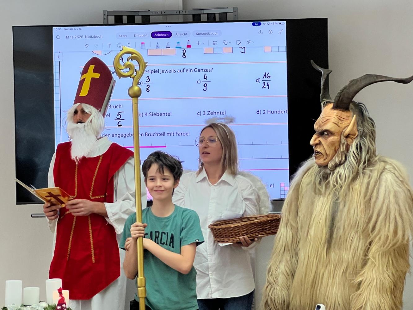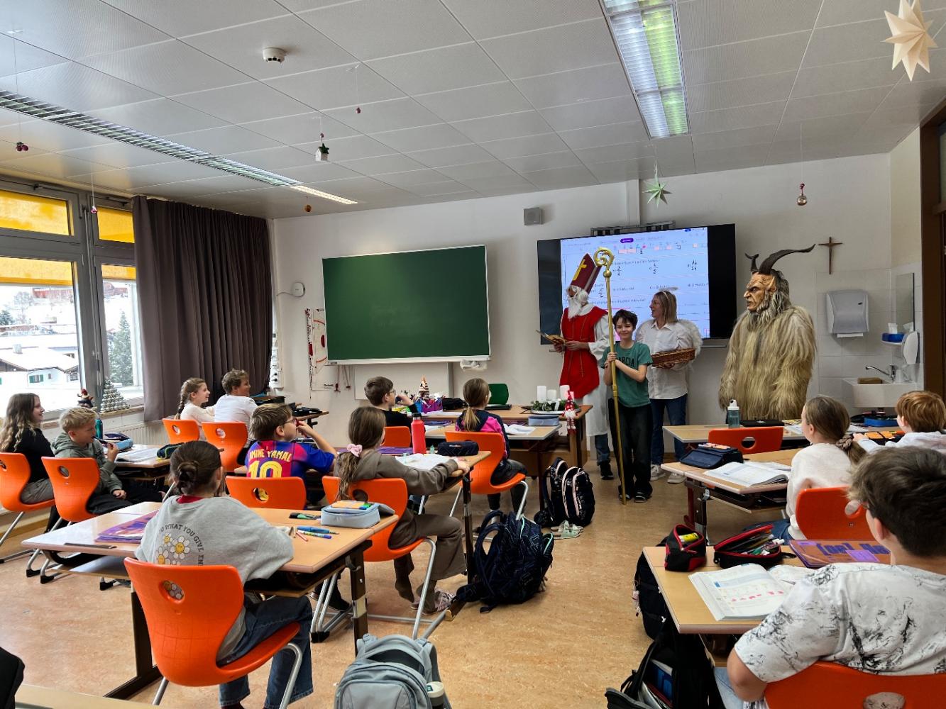 Hl Nikolaus besuchte die MS St. Anton von Thomas Geiger 05. Dezember 2025 2025/26 Über einen Kurzbesuch konnten wir uns erfreuen. Der Hl Nikolaus mit Engel und Krampalar besuchten unsere Schule. Mit einer kleinen Süßigkeit verabschiedete sich das Team um den Hl Nikolaus bei unseren Schüler:innen.