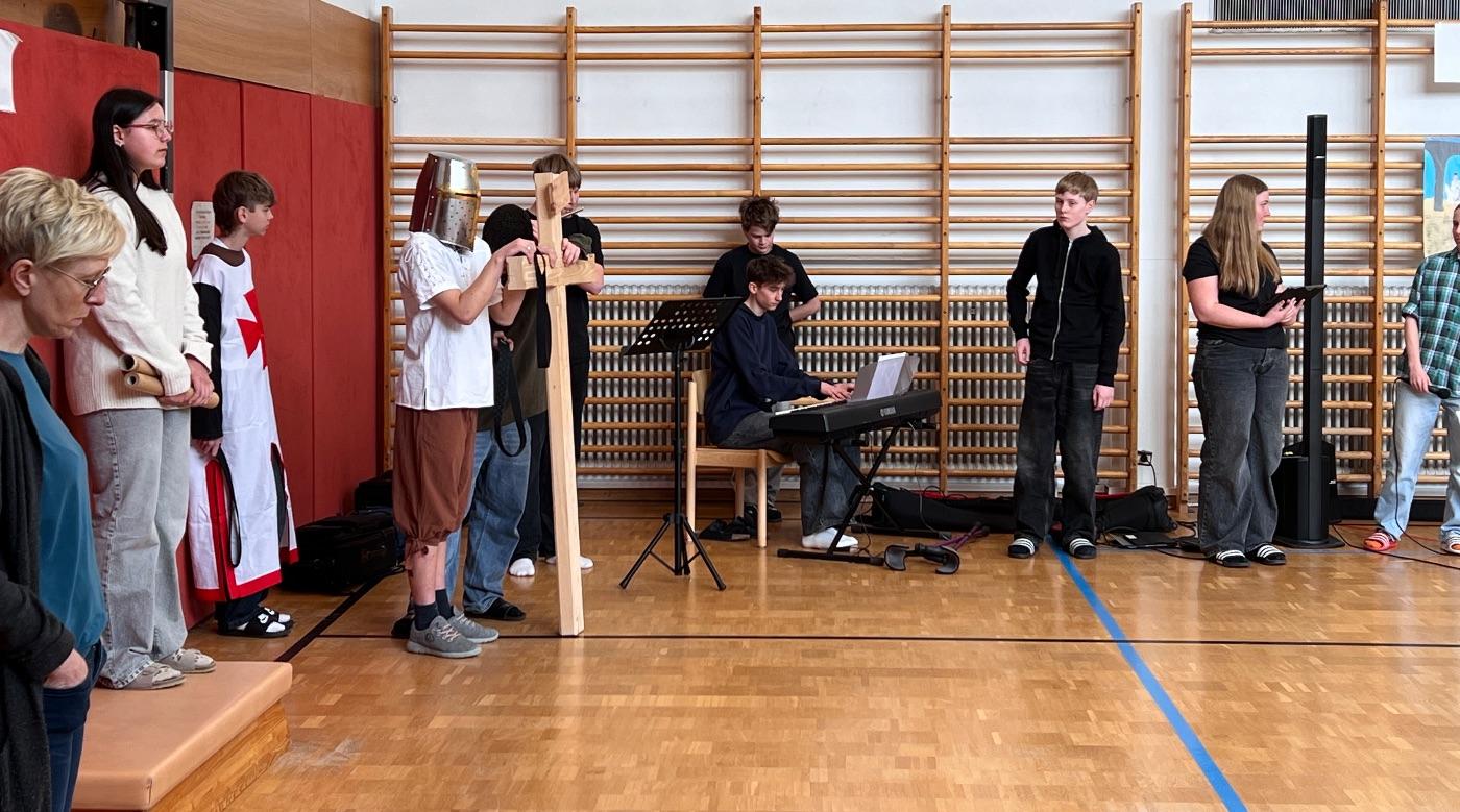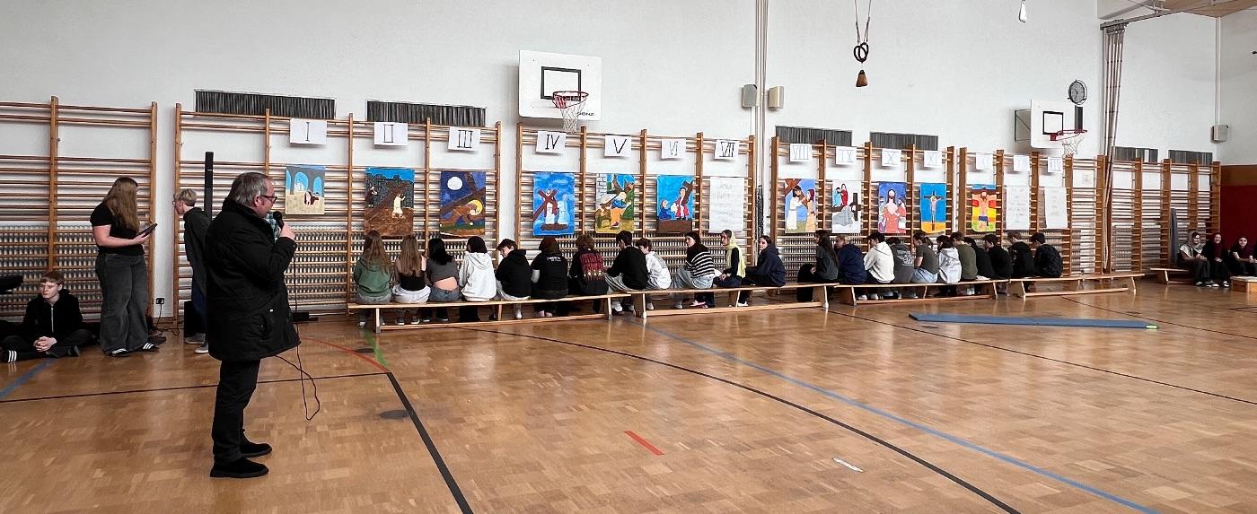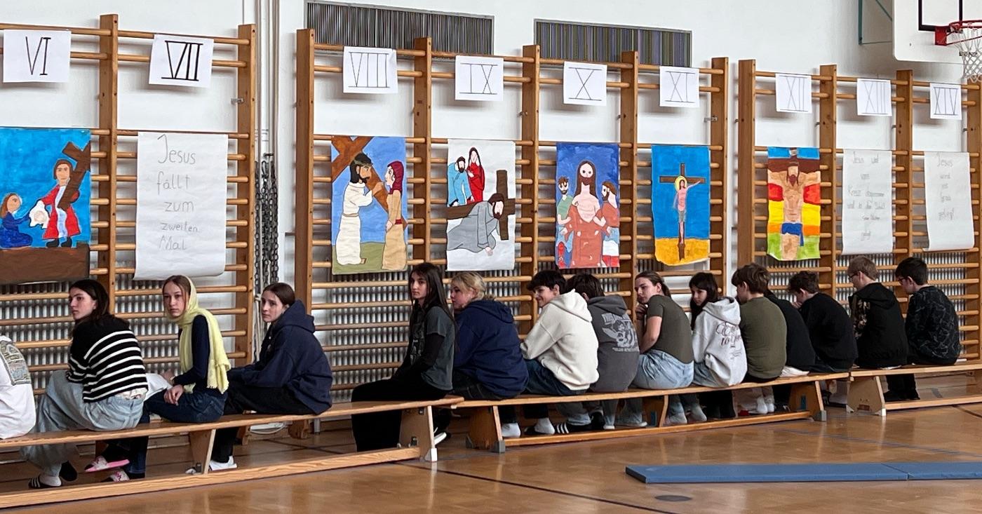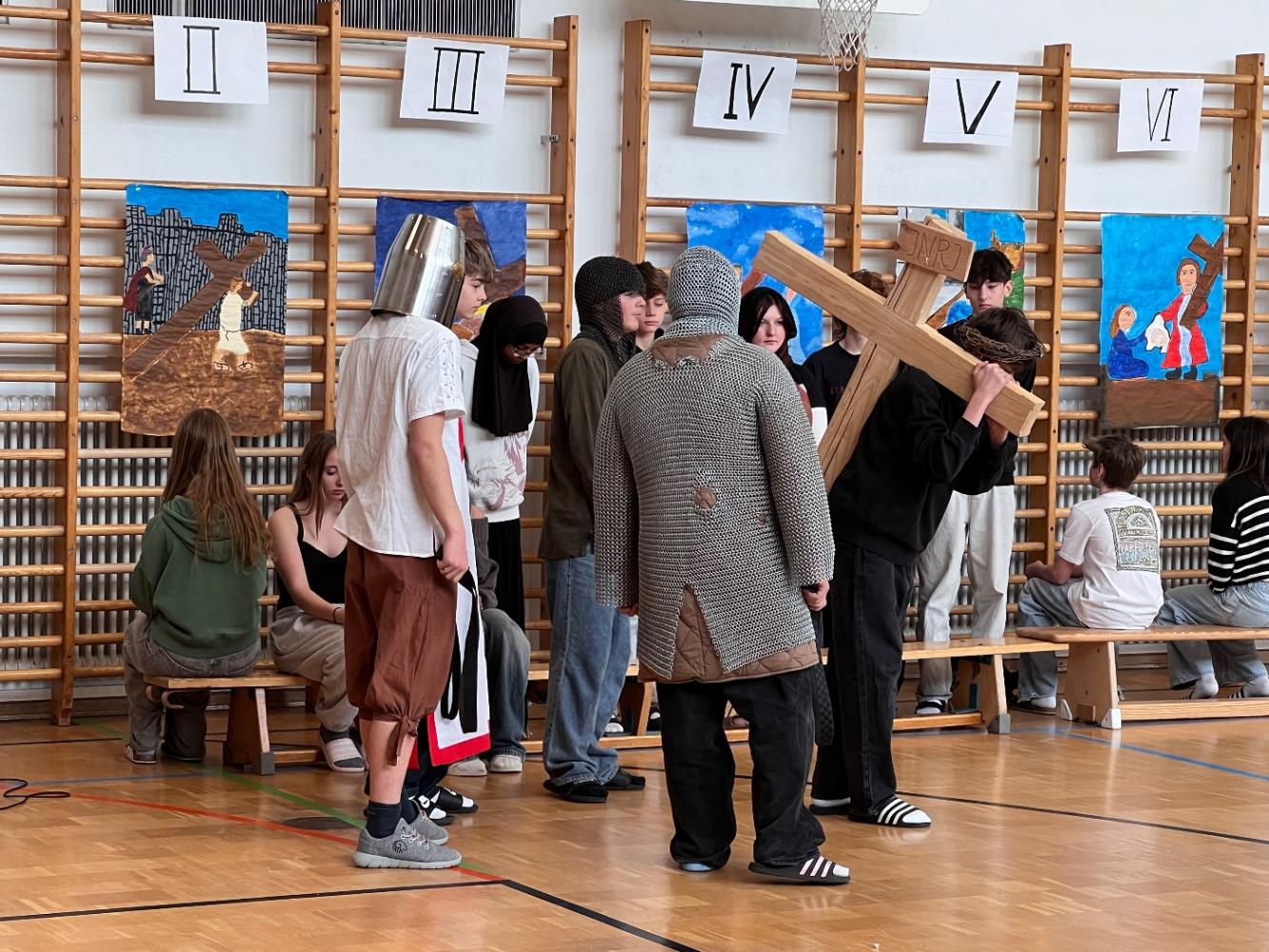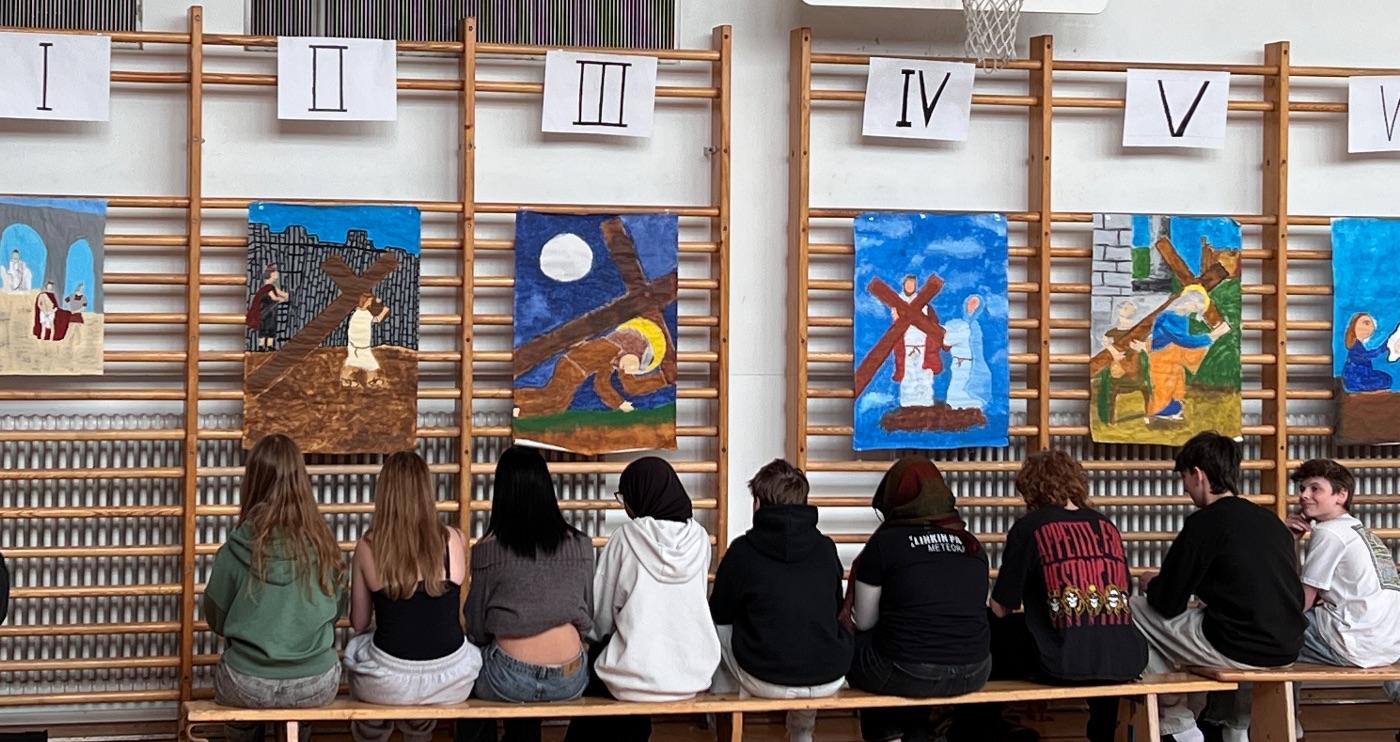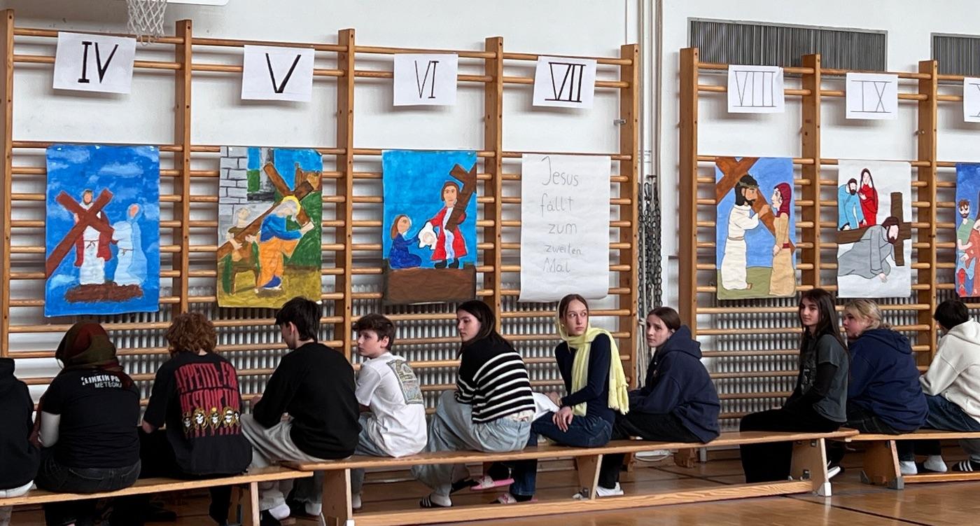 Es wurden alle vierzehn Stationen mithilfe von Plakaten dargestellt, die von Schülerinnen und Schülern der Klasse 4a, sowie 4b gezeichnet und anschließend ausgemalt wurden. Das tragische Ereignis, das Jesus und viele andere Menschen vor langer Zeit erleben mussten, wurde von einigen Mitschülerinnen und Mitschülern schauspielerisch nachgestellt. Es wurde alles musikalisch begleitet, indem einige Klassenmitglieder mit deren eigenen Instrumenten zwischendurch Musikstücke spielten. Das Publikum bestand aus den restlichen Klassen, sowie den Lehrerinnen und Lehrern, dem Herrn Direktor und dem Herrn Pfarrer Attila.