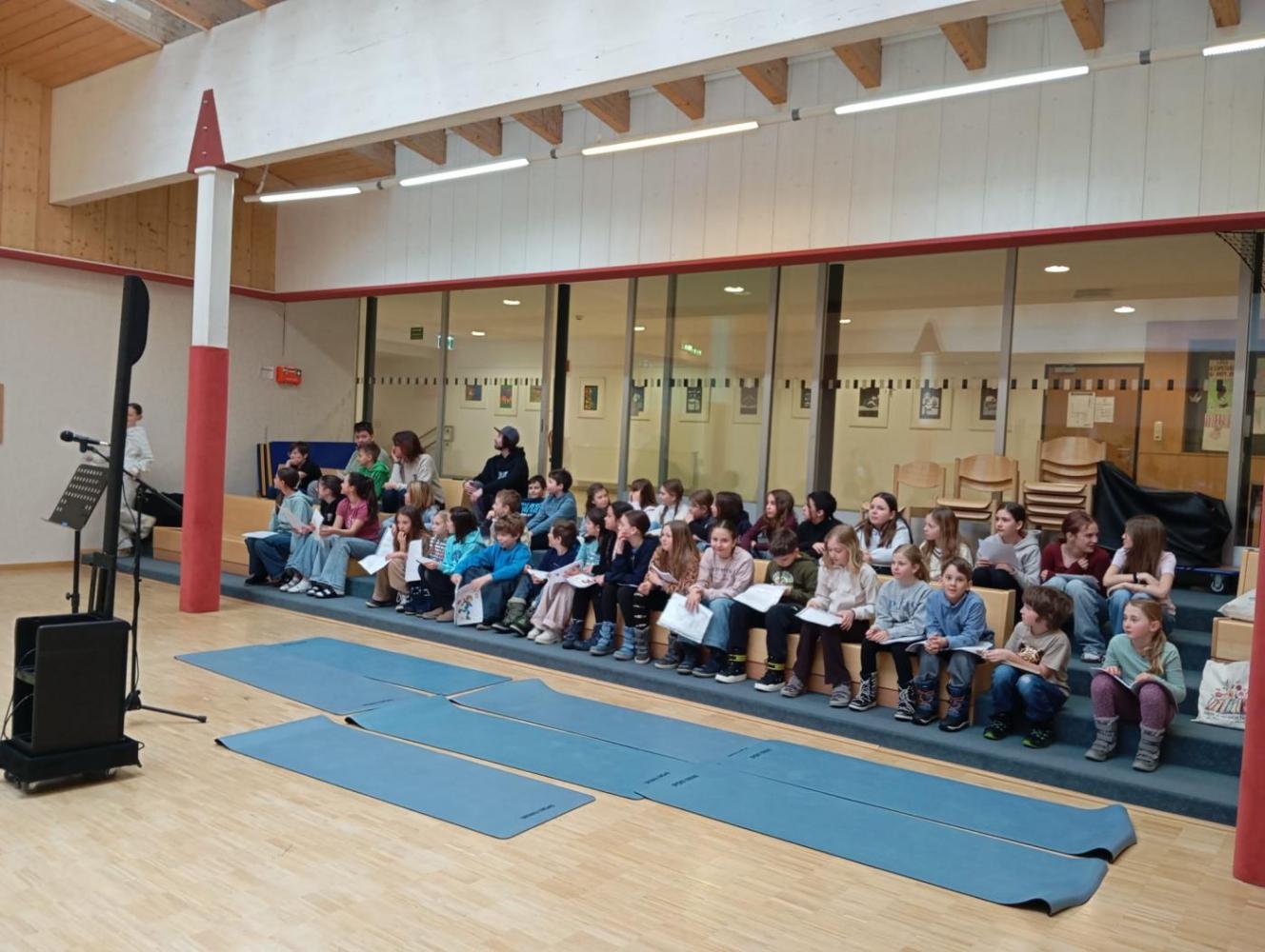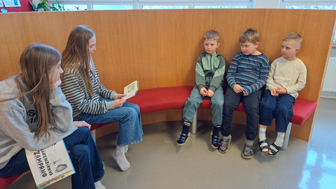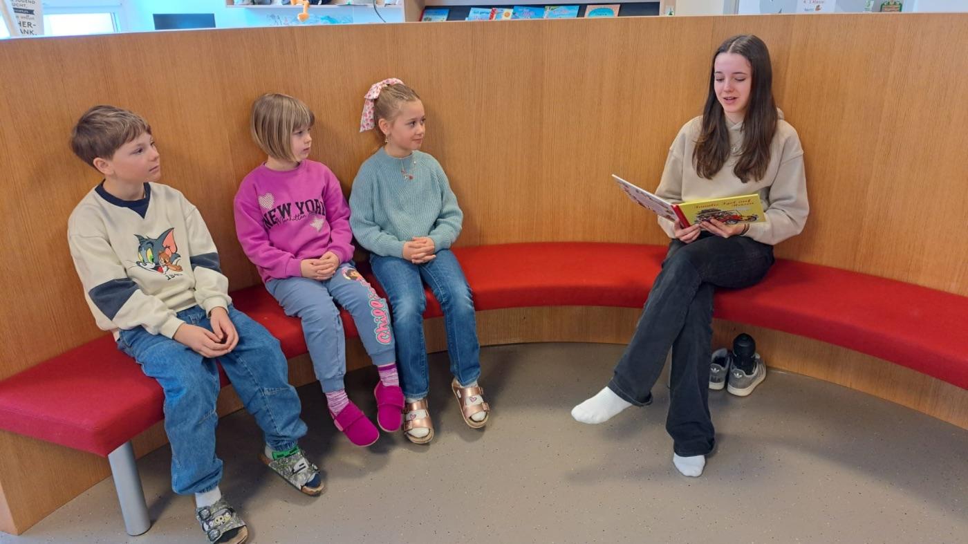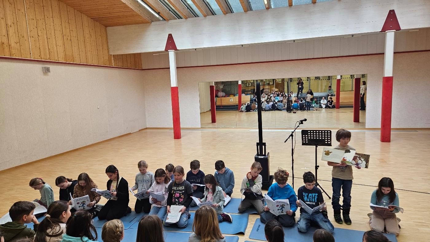 Zwei besondere Fixpunkte prägten den frühen Vormittag. Zuerst fand der sogenannte „Brückenschlag“ statt: Schülerinnen und Schüler der 2. und 3. Klassen der Mittelschule trafen sich mit Kindern der Volksschule St. Anton zum gemeinsamen Vorlesen.
